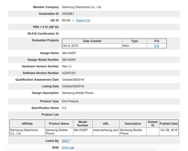 Unfortunately, the Bluetooth certification paperwork doesn’t reveal anything new about the Galaxy A3 (2017). Recent leaks, rumors and speculation point towards the unit packing a 4.7-inch display, a 1.5GHz octa-core Qualcomm CPU, 2GB of RAM, 8GB of expandable flash memory, a 13MP rear-facing camera, an 8MP selfie shooter and a variety of internal sensors, including a pedometer and barometer. It’s also expected to ship running Android 6.0.1 Marshmallow, but will likely be on the list to receive the Android 7.0 Nougat update.