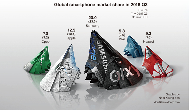 The dip in Samsung’s share likely has something to do with the Galaxy Note 7 debacle as the company had to put a lot of resources into repairing, reproducing and redistributing over 2.5 million handsets — including unsold stock — following its first official recall back on Thursday, September 15.