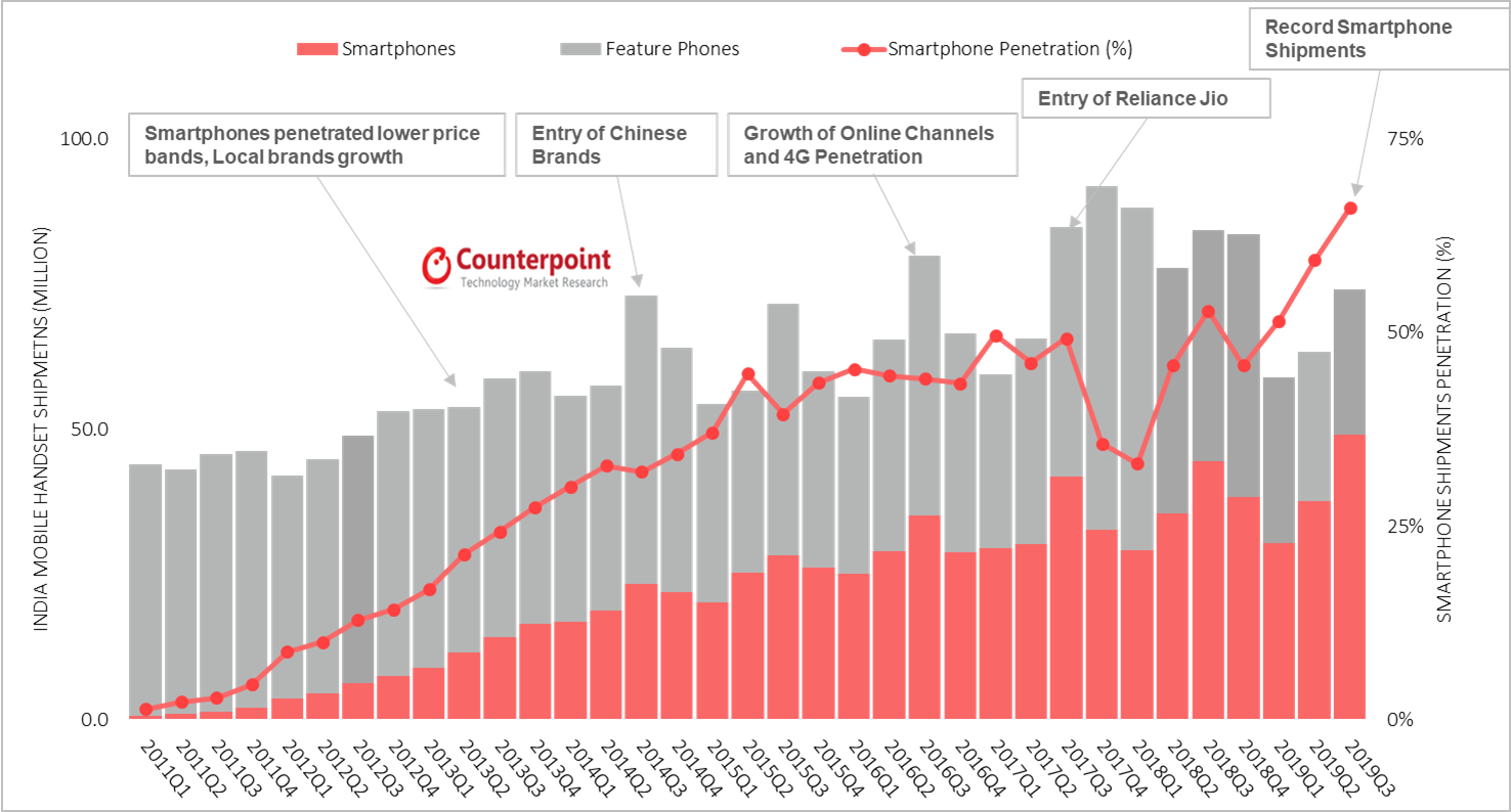 According to the Q3 2019 smartphone shipment data from Counterpoint Research, Xiaomi retained its position as India's biggest smartphone vendor with 26% market share. Samsung came in second with 20% market share, a drop of 3% compared to last year. Vivo, Realme, and Oppo, all of which belonged to the same parent company, occupied the next three spots, respectively.